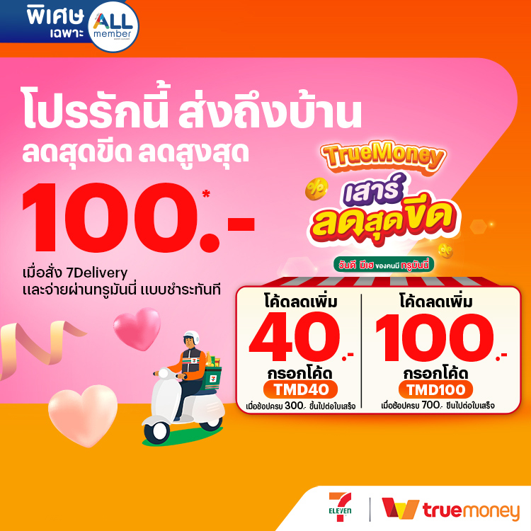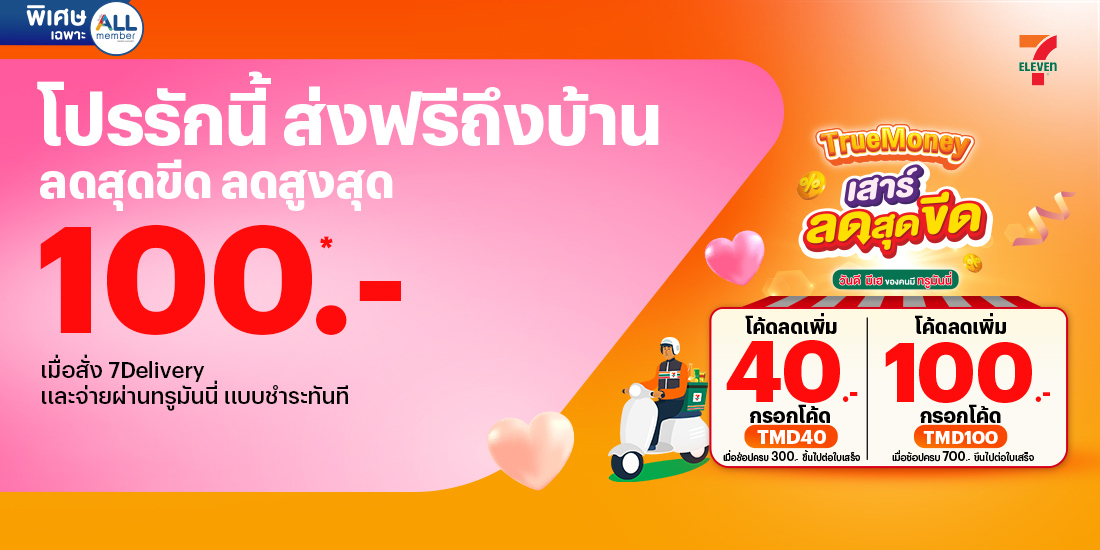 TrueMoney Day ! รับส่วนลดสูงสุด 100 บ. เมื่อซื้อสินค้า ผ่าน 7Delivery และจ่ายด้วยทรูมันนี่ แบบชำระทันที ผ่าน 7App