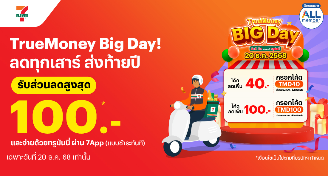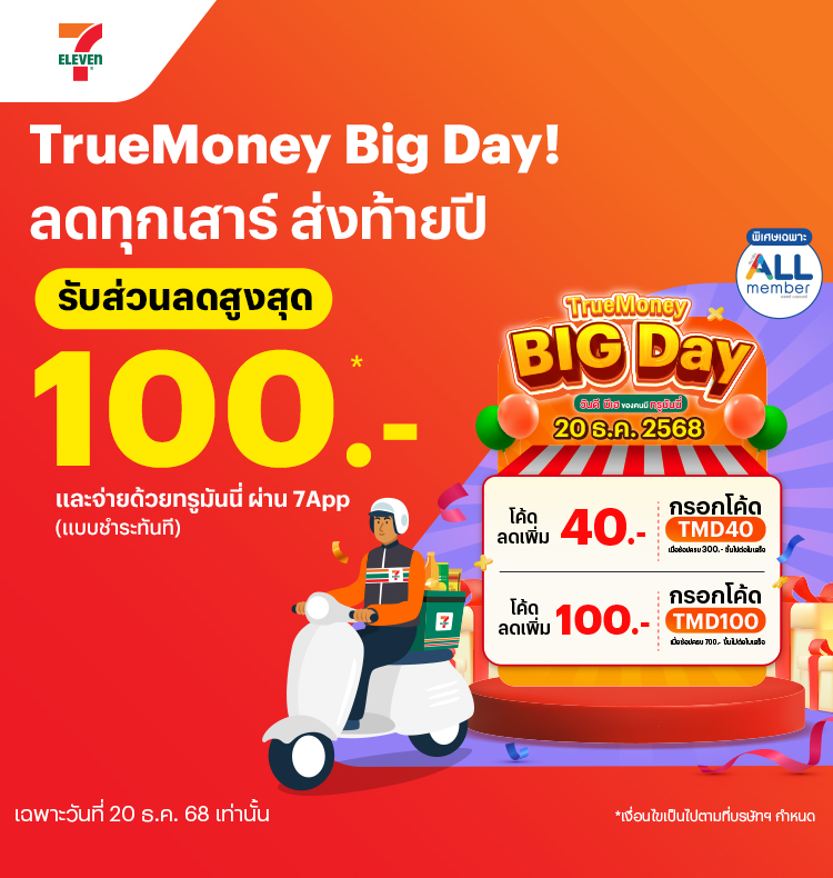 TrueMoney BIG Day รับส่วนลดสูงสุด 100 บาท เมื่อซื้อสินค้า ผ่าน 7Delivery ครบกำหนด และจ่ายด้วยทรูมันนี่ แบบชำระทันที ผ่าน 7App