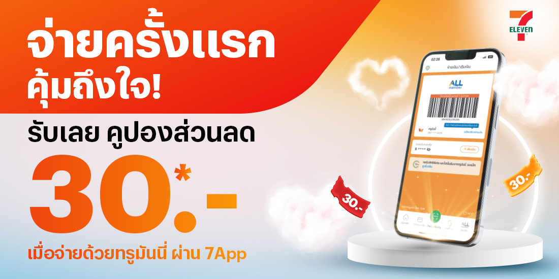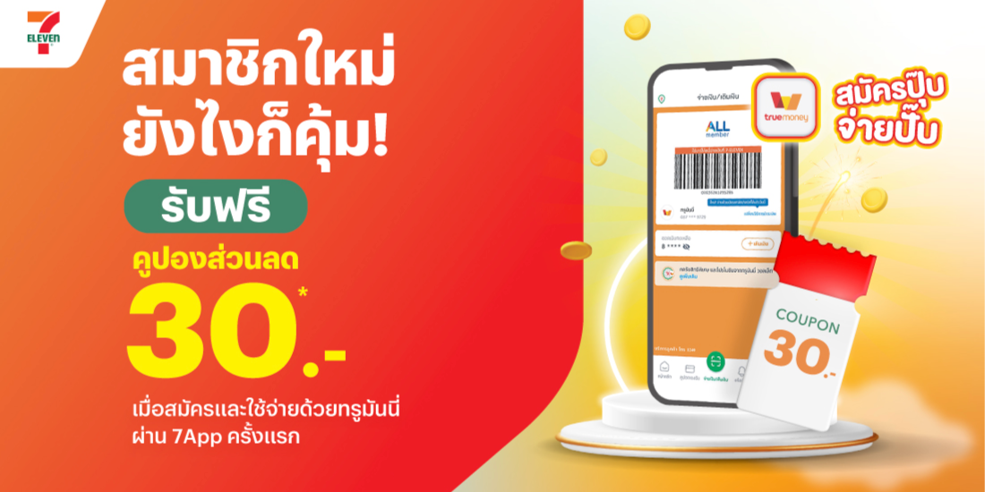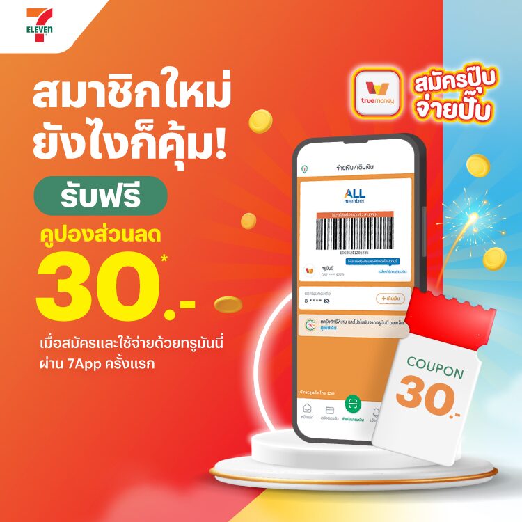 “สมัครปุ๊บ จ่ายปั๊บ รับฟรี! สิทธิ์ส่วนลด 30 บาท เมื่อสมัครและใช้จ่ายด้วยทรูมันนี่ครั้งแรก ผ่าน 7App”