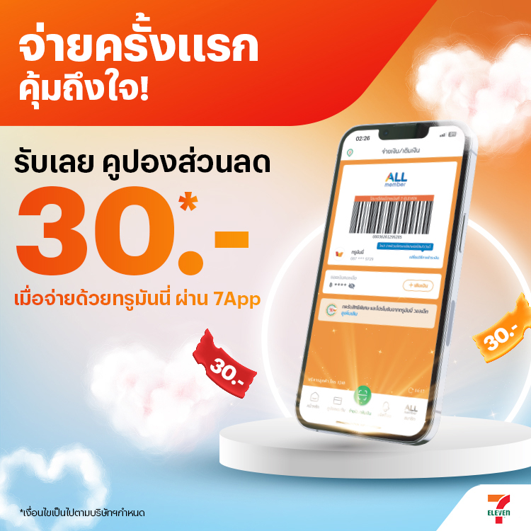 - สิทธิ์ส่วนลด 30 บาท ใช้เป็นส่วนลดครั้งถัดไป เมื่อซื้อขั้นต่ำ 100 บาท ที่ร้าน 7-Eleven หรือ 7Delivery สามารถใช้ได้ถึงวันที่ 28 ก.พ. 69