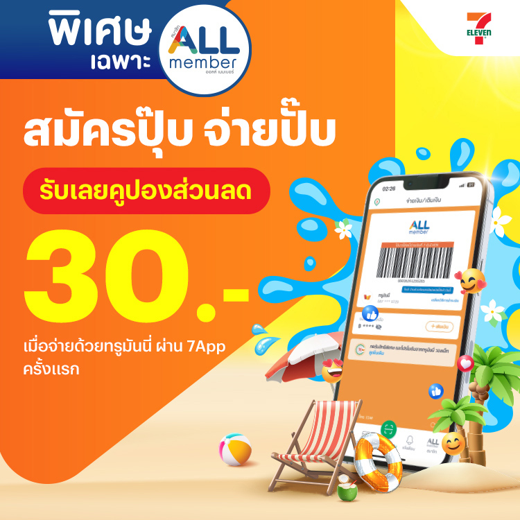 - สิทธิ์ส่วนลด 30 บาท ใช้เป็นส่วนลดครั้งถัดไป เมื่อซื้อขั้นต่ำ 100 บาท ที่ร้าน 7-Eleven หรือ 7Delivery สามารถใช้ได้ถึงวันที่ 30 เม.ย. 69