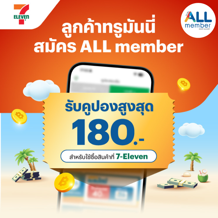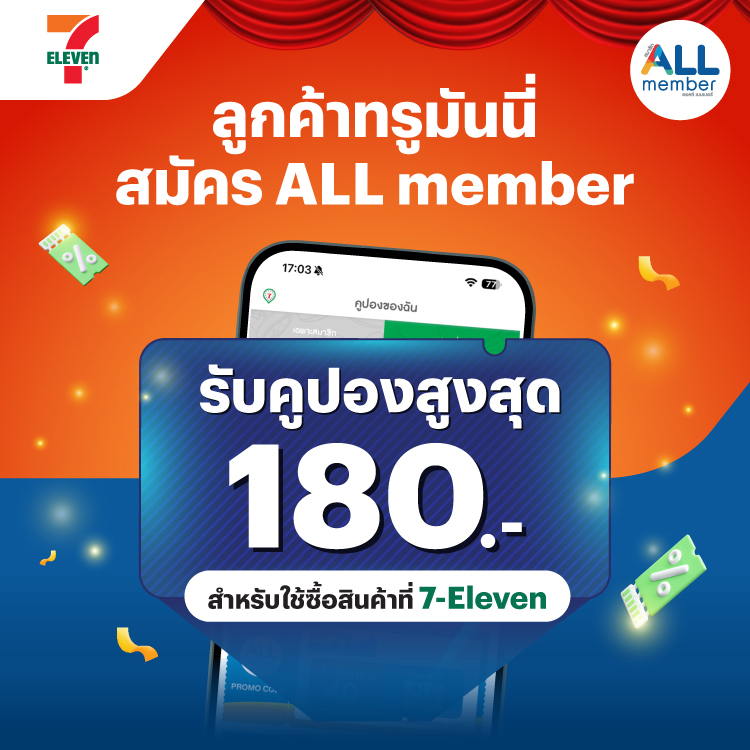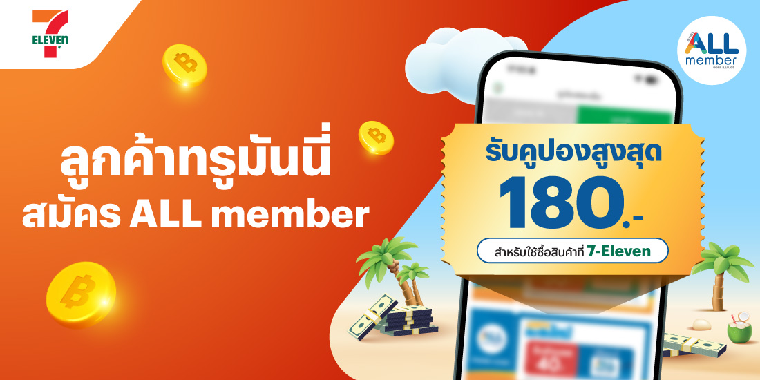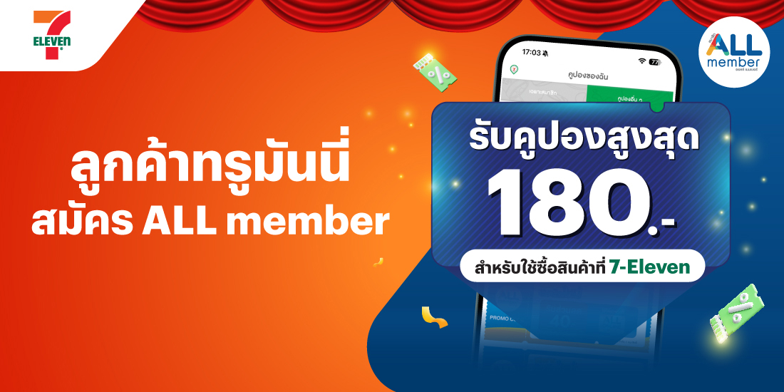 พิเศษ! สำหรับลูกค้าที่สมัครสมาชิกออลล์ เมมเบอร์ ผ่านแอปทรูมันนี่ รับทันที คูปองส่วนลด 160 บาท เมื่อช้อปและแสดงความเป็นสมาชิกครั้งแรกที่ 7-Eleven พิเศษเฉพาะลูกค้าทรูมันนี่ รับคูปองส่วนลด 20 บาท เมื่อซื้อสินค้าครบ 100.- (จะได้รับเมื่อสมัครผ่านแอปทรูมันนี่เท่านั้น)