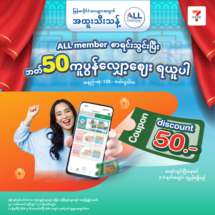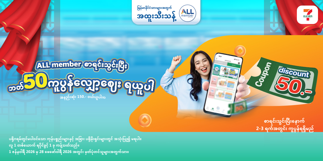 ALL member တရင်းသွင်းပြီး သတ် 50 ကူပွန်လျှော့စျေး ရယူပါ အနည်းဆုံး 150.- ဝယ်ယူပါက