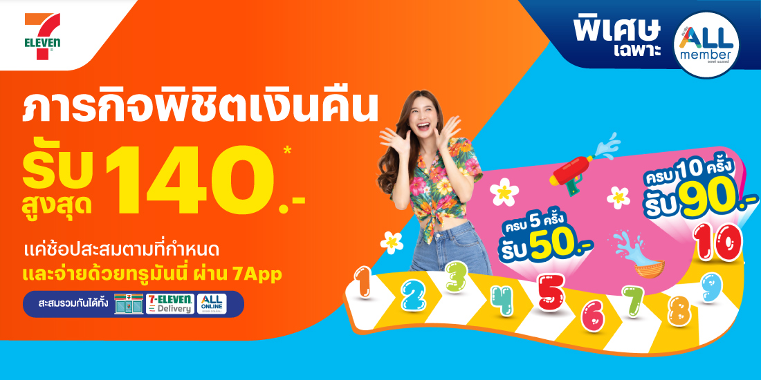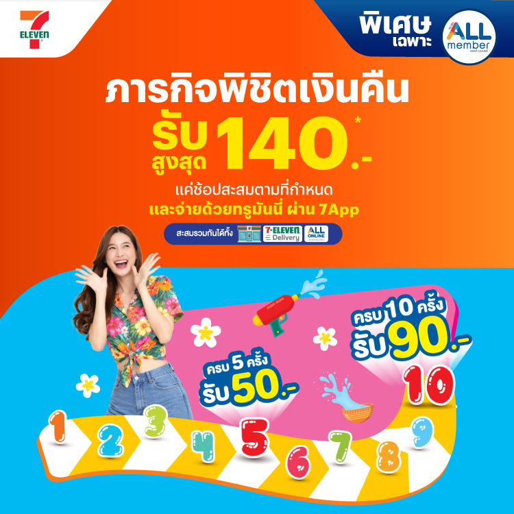 รับฟรี! เงินคืนสูงสุด 140 บาท เมื่อซื้อสินค้าที่ร้าน 7-Eleven หรือ7Delivery หรือ All Online ครบ 10 ครั้ง ขั้นต่ำ 200 บาท/บิล และเลือกจ่ายด้วยทรูมันนี่ ผ่าน 7App