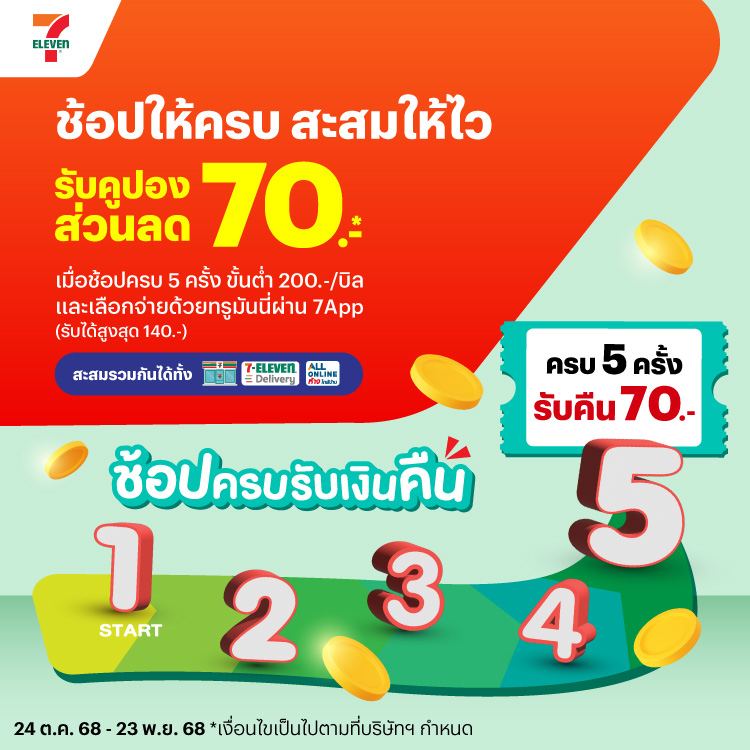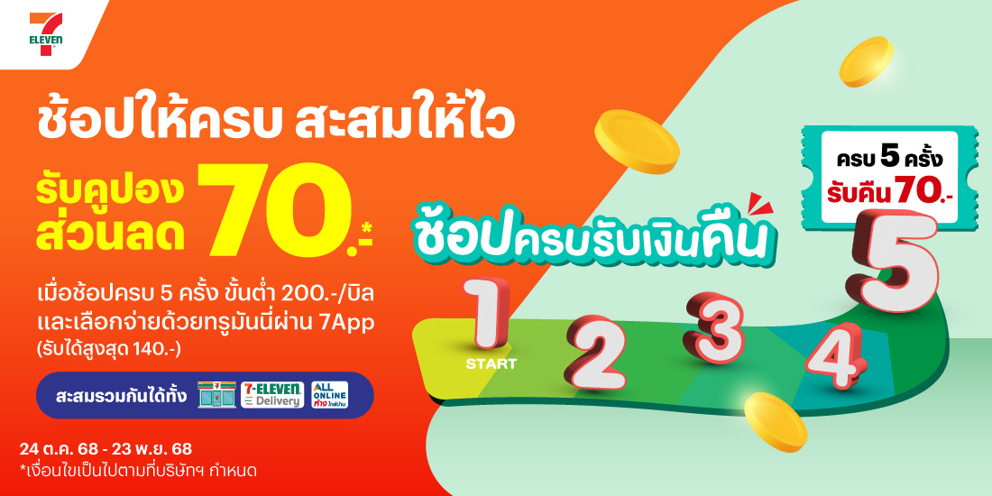 ซื้อสินค้าที่ร้าน 7-Eleven หรือ 7Delivery หรือ All Online ครบ 5 ครั้ง ขั้นต่ำ 200 บาท/บิล เลือกจ่ายด้วยทรูมันนี่ ผ่าน 7App รับฟรี! คูปองส่วนลด 70 บาท สำหรับซื้อสินค้าในครั้งถัดไป (รับคูปองส่วนลดเพิ่มอีก 70 บาท เมื่อซื้อสะสมครบ 10 ครั้ง)