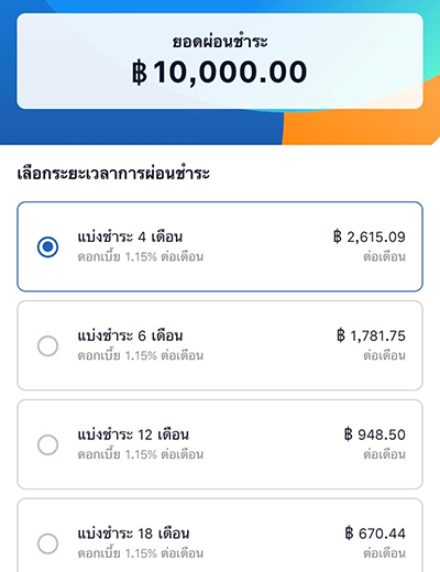 ลูกค้าสามารถเลือกผ่อนได้ตั้งแต่ 4 เดือน สูงสุด 48 เดือน เมื่อมีค่าผ่อนต่อเดือน เท่ากับหรือมากกว่า 100 บาทขึ้นไป ดอกเบี้ยจะถูกคำนวณแบบอัตราลดต้นลดดอก โดยจะไม่เกิน 25% ต่อปี