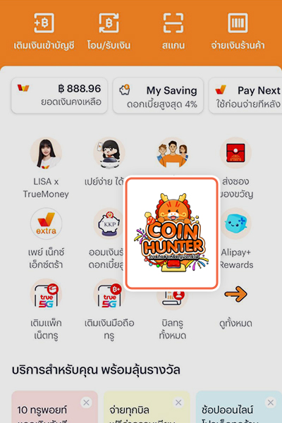 - ผู้เข้าร่วมรายการส่งเสริมการขายจะต้องเข้าไปที่แอปพลิเคชันทรูมันนี่ แล้วเลือกไอคอน หรือแบนเนอร์ (Banner) ของรายการส่งเสริมการขาย “ภารกิจล่าเหรียญมังกรไฟ” เพื่อเข้าสู่หน้าหลักของรายการส่งเสริมการขายก่อนเป็นลำดับแรก