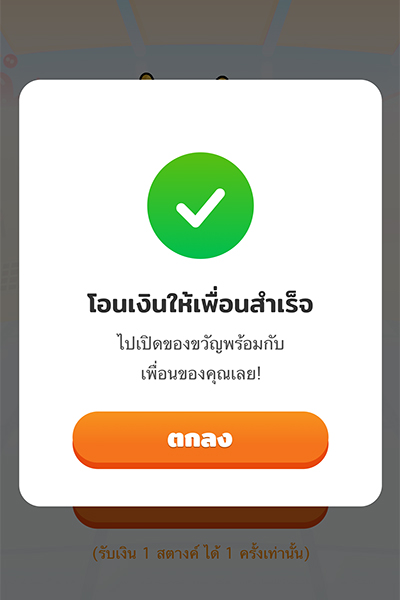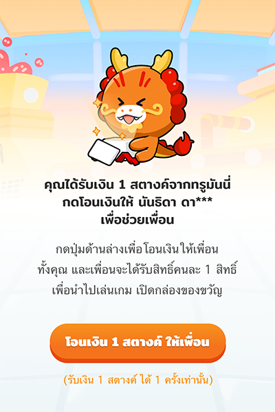 - เมื่อเพื่อนตอบรับคำเชิญและโอนเงินกลับสำเร็จ คุณและเพื่อนจะได้รับสิทธิ์เล่นเกมคนละ 1 สิทธิ์ เพื่อเปิดกล่องของขวัญรับ TrueMoney Coin
