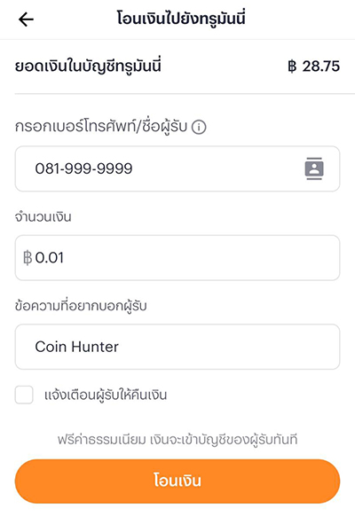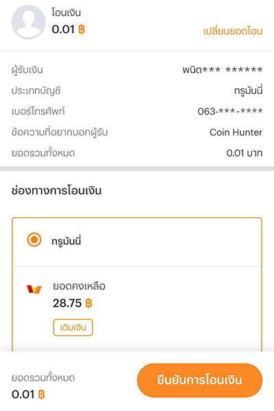 4. กดปุ่ม โอนเงิน 1 สตางค์ ที่ได้รับจากทรูมันนี่ แล้วโอนกลับให้เพื่อน