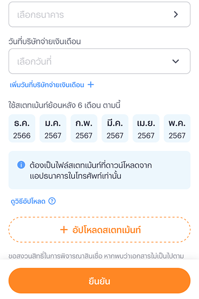 - รายการเดินบัญชีธนาคารย้อนหลัง 6 เดือนล่าสุด รวมเดือนปัจจุบัน เป็นไฟล์ PDF เท่านั้น