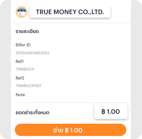 - ทำรายการสแกนคิวอาร์พร้อมเพย์ดังกล่าวเพื่อจ่ายเงินจำนวน 1 บาท ด้วยบัญชีทรูมันนี่ของผู้เข้าร่วมรายการส่งเสริมการขายไปยังบัญชีพร้อมเพย์ที่บริษัทกำหนด