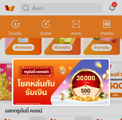 - เข้าแบนเนอร์สำหรับร่วมกิจกรรมรายการส่งเสริมการขาย “ โชคหล่นทับ แจกเงินรวมกว่า 50,000 บาท บาท” บนแอปพลิเคชัน ทรูมันนี่