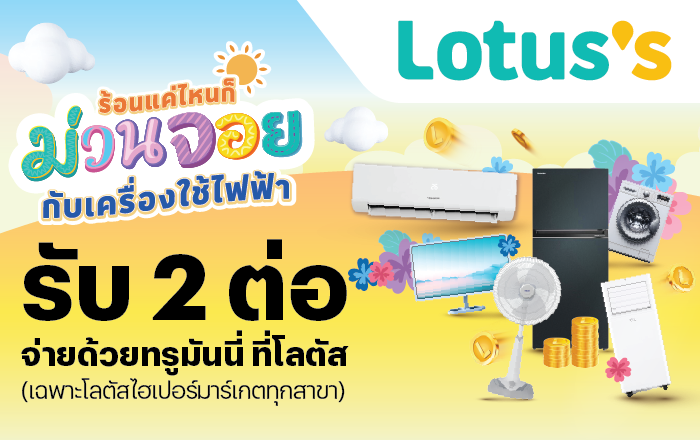 Lotus'sผ่อน 0% นาน 36 เดือน เครื่องใช้ไฟฟ้าได้ทุกชิ้น ที่โลตัส พร้อมรับเงินคืนสูงสุด 4,000 บาท1 มี.ค. 69 - 31 ธ.ค. 69