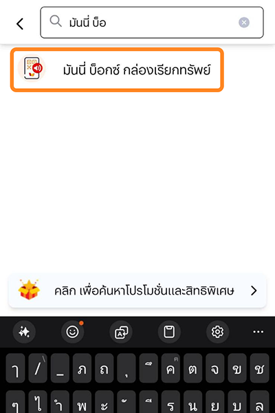2. พิมพ์คำว่า “มันนี่ บ็อกซ์” ในช่องสำหรับค้นหา และ เลือก มันนี่ บ็อกซ์ กล่องเรียกทรัพย์