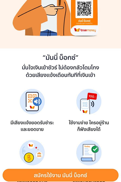 - ลูกค้าไม่ได้สแกนจ่ายจริง จึงไม่ส่งเสียงร้อง ดังนั้นให้ทำการเปิดแอปทรูมันนี่ เข้าไปที่ ร้านค้าทรูมันนี่ และเลือกมันนี่ บ็อกซ์ เพื่อเช็ครายการรับชำระเงิน